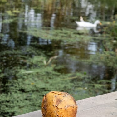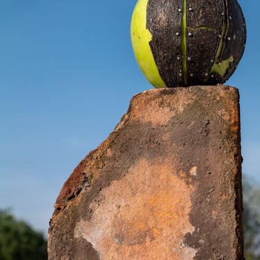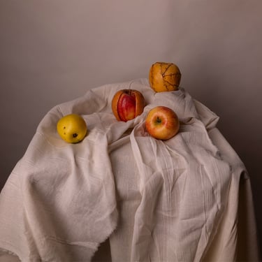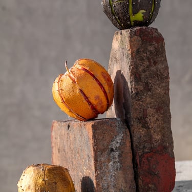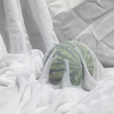 Teniendo en mente Extranjeros por todas partes, quería entender el concepto de extranjero y encontrarlo, si acaso, en mi día a día. Lo encontré fácilmente en las manzanas como producto de consumo ya fuera en el supermercado donde la oferta me permitió notar la variedad de manzanas y su procedencia (principalmente EU); sin embargo en la recaudería la oferta era principalmente producto mexicano. Todo esto aparentaba muchas cosas y las más obvias eran las diferencias físicas y de costo. Así que comencé a cubrir las manzanas gringas con cáscaras de productos mexicanos, de tal manera que una piel sometiera a la otra en una especie de confección a través de alfileres que pudieran delinear y mostrar esta capa ajena a la fruta pero que permitiera coexistir una dentro o sobre la otra. Esta manipulación me permitió representar el concepto de extranjeros por todas partes desde las inevitables cadenas de consumo con productos extranjeros, la transformación de la fruta representa diferencias, límites, pertenencia, marca, identidad, camuflaje, ajeno.