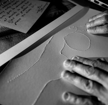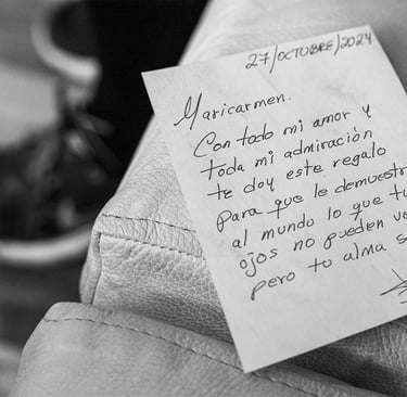 Domingo 27 de octubre 2024. Hoy sería un día movidito, empezamos el día en su casa, la noche anterior fui a imprimir las fotografías que Maricarmen había hecho hasta el momento para que ella las tuviera impresas y supiera cuántas llevaba. Nos dimos cuenta que en su selección ya iban cuarenta y nueve fotografías, estaban distribuidas en hojas doblecarta, quería saber si al tacto ella podía sentir el relieve de la impresión y solamente en algunas lo percibía...