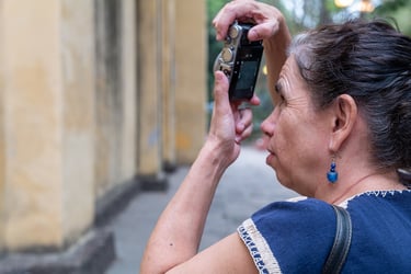 En mi descripción hablamos de la cruz, que teníamos enfrente, que estaba rodeada de arbustos, del número de bancas que nos rodeaban, le describí las personas que se encontraban sentadas, escuchó pasar una niña en bicicleta con sus papás, hablamos del piso que es de piedras de río y que se encontraba lleno de unas hojitas, las cuales tocó. Le comenté que la Casa Azul, en realidad estaba pintada de rojo y en qué dirección estaba. Que el paisaje en general era árido y que había papel picado colgado de los árboles y rodeaba esa zona donde nos encontrábamos. Ella me preguntó si ¿el viento influía en las fotografías? y entonces le hablé de los barridos y congelados. Que existe una cortinilla dentro de la cámara, como un telón que si se abre y cierra rápido, y entonces congela o puede abrirse lento y entonces barre los movimientos; a eso se le llaman velocidades de exposición.