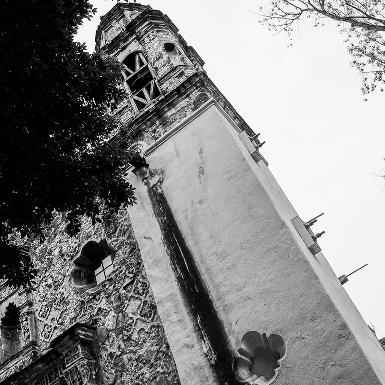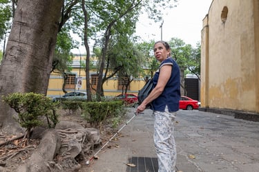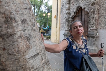 Regresamos al frente de la iglesia, y en el camino le pregunté sobre el uso de su bastón, me lo prestó y me explicó que con él siente las piedras, hojas, coladeras, distancias. Estando frente a la iglesia a mi descripción le agregué un árbol que se encuentra frente a ésta pero de lado derecho con su propia «base» y se acercó para sentir el tronco y lo describió como grueso. En su imaginación pensaba que la iglesia no era tan alta y por tanto que el campanario no estaba tan lejos. La última foto de ese día se la imaginó con el árbol, el campanario y si se podía la puerta de la iglesia.