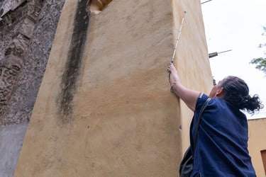 Caminamos hacia la iglesia, se la describí en color, tamaño, le comenté que tenía dos campanarios; sintió con sus manos la puerta, las paredes y nos movimos hacia la cara izquierda de ésta. En sus paredes, de color amarillo, había las huellas de un grafiti que habían pintado para taparlo pero siguiendo justamente la forma de éste, así que el dibujo se seguía de alguna manera viendo como velado por la pintura. Eso llamó la atención de Maricarmen y quizo fotografiar esa pared con la idea de que se viera también el lado de la iglesia y su campanario. En cada intento le describía el resultado y a partir de ahí reorientaba la toma. Las siguientes veces antes de hacer la toma le describía lo que se veía en pantalla estando ella posicionada y la reorientaba hasta que se viera lo que ella esperaba.