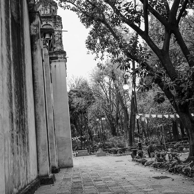 Primero disfrutamos de una comida donde platicamos de nuestras vidas, para mí es importante saber cómo se siente Maricarmen. Nos tocó una tarde muy calurosa que al poco rato se convirtió en un atardecer de color frío y con unas pocas gotas de llovizna. Nos trasladamos a la Conchita y esta vez la clase fue práctica y el día me sirvió para comentarle tres cosas básicas, la temperatura de color de la luz que en este caso se encontraba azulada por la hora y porque estaba nublado; y al estar nublado la luz es suave, es decir sin sombras, una luz pareja. Nos sentamos en las bancas rojas de cemento que rodean una cruz. Le describí el lugar, ella recordaba la Casa Azul, que es una especie de escuela-teatro. Recordaba de alguna manera el lugar, pues de chica lo había visitado y se imaginaba que las casas eran las «típicas de Coyoacán».