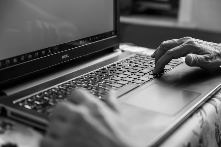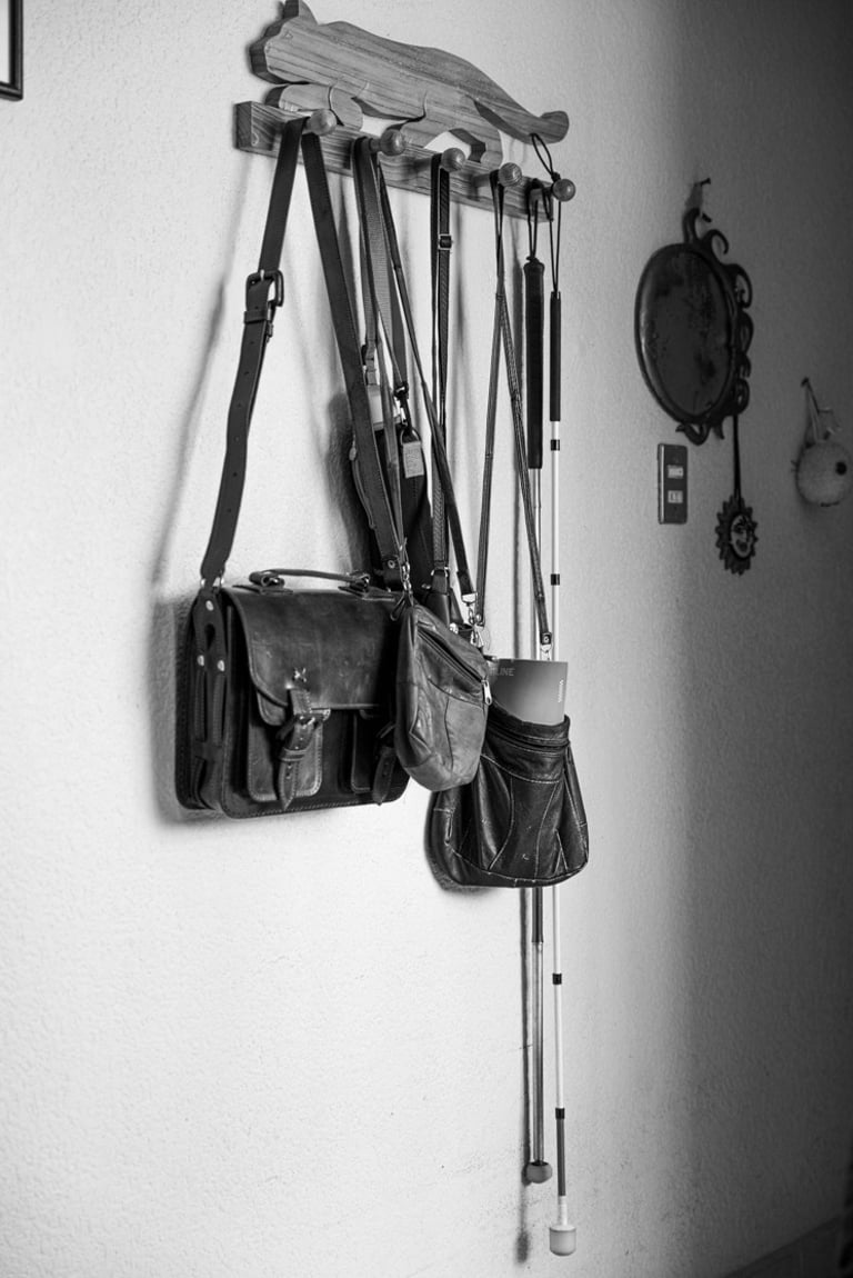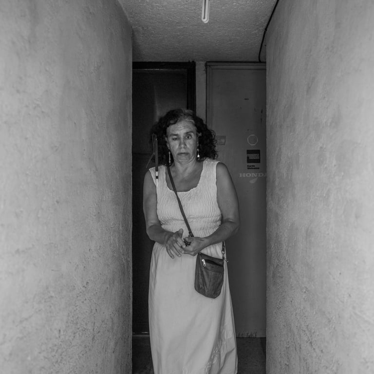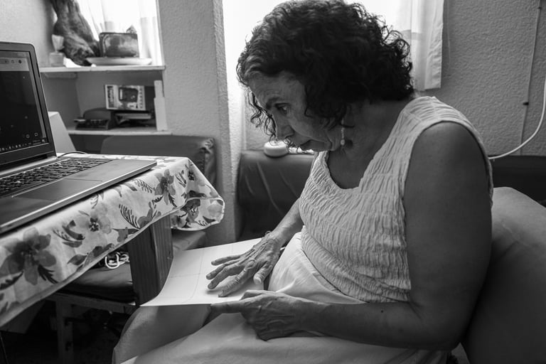 Después de avanzar por un pasillo, son dos pisos los que tenemos que subir, el piso es jaspeado con motes de café pero predomina el beige. El barandal es negro y de metal. Para llegar a su casa recorremos unos tres vecinos, todos del lado derecho, la puerta del fondo con una reja de metal gris claro es la casa de Maricarmen. Mientras abre la puerta noto que tiene unas macetas con plantas bien cuidadas. Ella al entrar se limpia los pies y en esta época se siente un ambiente muy caluroso. Lo primero que se ve es una pared que corresponde al pasillo principal de su casa. Ella coloca su bolsa y bastón en un perchero. Me recibe con unas nueces de castilla, mi silla ya puesta y me brinda un vaso de agua. Ella esta vez vestida de blanco. Nos encontramos sentadas frente una mesa donde ella tiene su computadora, es su lugar de trabajo. Su computadora tiene unas marcas que le permiten a ella ubicarse con el tacto y controlarla, además le habla y a una velocidad que yo no puedo entender. Es increíble la rapidez con la que maneja sus equipos.