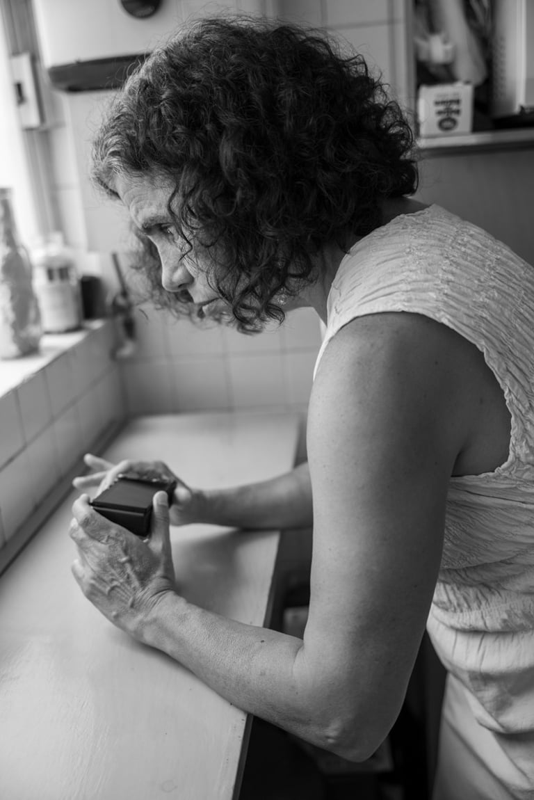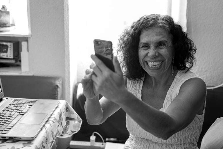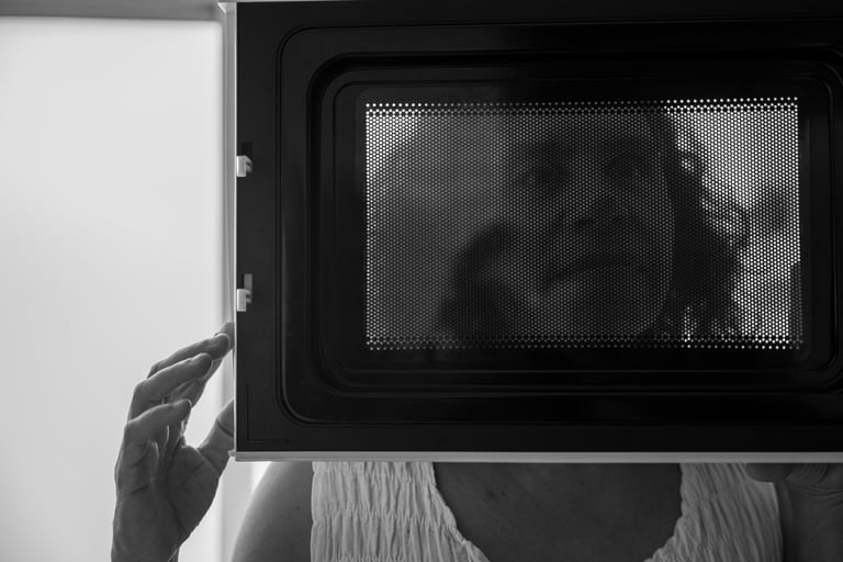 Estuve tomando selfies con el celular. Le mostré a Irlanda la herramienta que tiene el i-phone para centrar la imagen en una foto. Le mostré también las fotos del Fotodiario de la pandemia, un proyecto que desarrollamos en ese tiempo con un colectivo de artistas con diferentes discapacidades, en donde, en mi proyecto personal, traté el tema de la edad, lo efímero, el cambio, el tiempo. En aquel proyecto había planeado a todo detalle algunas de las fotos que quería lograr, y ese día, con Irlanda, traté de recrear en especial una de ellas, de una serie en donde hablaba de la edad, del paso del tiempo, comparando texturas de mi piel, de frutas y de superficies. Quise captar un limón con su color y su textura, contrastando con el color y la textura de una superficie de madera naranja de mi cocina, que es bastante luminosa. Me gustó imaginar ese contraste tan fuerte del verde del limón viejo con el naranja intenso de mi cocina. Tomé varias fotos de esa imagen que tenía clarísima en mi imaginación. En un principio me gustó que Irlanda me guiara en los detalles, aunque, después de las descripciones que ella me hacía de los resultados, me sentí incapaz de lograr justamente la imagen que yo quería, ya que, a la hora de apuntar la cámara al objetivo, siempre me quedaba mal acomodada. Necesitaba demasiado de los ojos de Irlanda para enfocar justo lo que quería. Me sentí un poco frustrada al pensar que no iba a poder lograr una buena foto sin ayuda de alguien. También intenté sacar una foto de mi rostro detrás de la puerta de vidrio reticulado del microondas. Me gustó imaginar mi cara a través de ese vidrio que le ponía un filtro y una distorsión a la imagen de mi cara. Irlanda me dijo que en una de las fotos salía simultáneamente con mi rostro, el reflejo de su propio rostro. Me encantó pensar en ese reflejo de Irlanda viéndose en mi propia cara, como amalgamando nuestras 2 miradas.