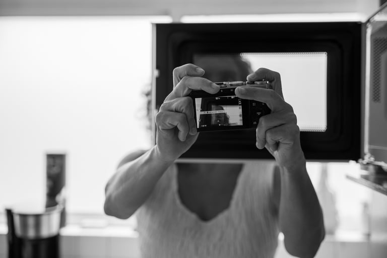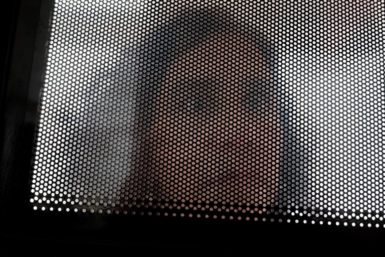 Decidimos hacer la práctica en su casa y como ella es color buscó un limón en su refrigerador y lo colocó sobre la barra anaranjadísima de su cocina. Frente a la barra está una ventana, como esmerilada, brindaba una luz suave pero muy intensa, así que le comenté de la sombra suave que se estaba haciendo por las condiciones de luz. Hablamos del punto de vista, si la hacía en picada se vería puro color y si lo hacía a ras de la tabla tendríamos un fondo con un punto de fuga y fuera de foco. Después se interesó por la puerta del microondas y le pareció interesante hacerse un retrato a través de ella. El resultado fue muy interesante porque si nos acercamos la imagen parece pura retícula y al alejarnos vemos el rostro de ella.