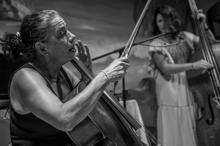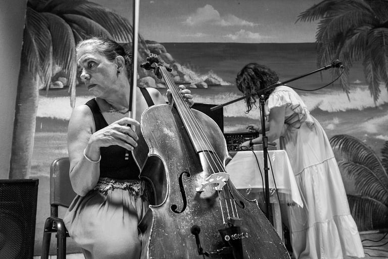 Maricarmen improvisó una pieza de aproximadamente catorce minutos. El lugar estaba cautivado y atento mientras pasaban los transeúntes y de reojo miraban y escuchaban. Lo más atractivo para mí fue que Maricarmen hacía sonidos con su voz que realmente se mezclaban con el sonido de las cuerdas, pero además iban acompañadas de expresiones faciales que hacían una pieza desde las entrañas de Maricarmen. Al finalizar la pieza ella estaba exhausta y acalorada por el clima que caracteriza hoy nuestra ciudad. Después del primer acto hubo un descanso bastante largo donde todos convivían con todos. Para el segundo set la participación fue de Adriana entre las cuerdas de su bajo, voz y multimedia. Nuevamente un descanso y para el tercer set las dos participaron improvisando, fue un encuentro interesante. El evento terminó alrededor de las 11:15.