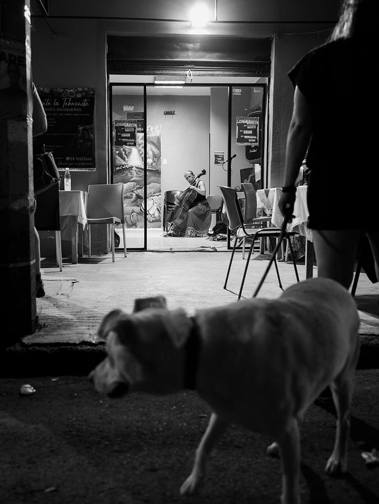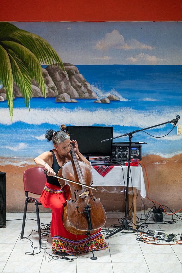 Viernes 31 de mayo 2024. Hoy asistí al evento «Experimento 05» donde Maricarmen participó improvisando en un «primer set» ella sola y en un «tercer set» con Adriana Camacho. Fue interesante el lugar pequeño, oaxaqueño y con mucho color. Mi llegada fue temprano para poder documentar a Maricarmen y Adriana mientras se preparaban. La cita se fue postergando y el evento comenzó a las 8.30 aproximadamente y ya las mesas se encontraban ocupadas entre mexicanos, extranjeros, músicos y amigos cuando un grito sorpresivo, al muy estilo referee de lucha libre mexicana, anunciaba y presentaba a Maricaaaaaaaaarmen GrAAAAAAAAue.