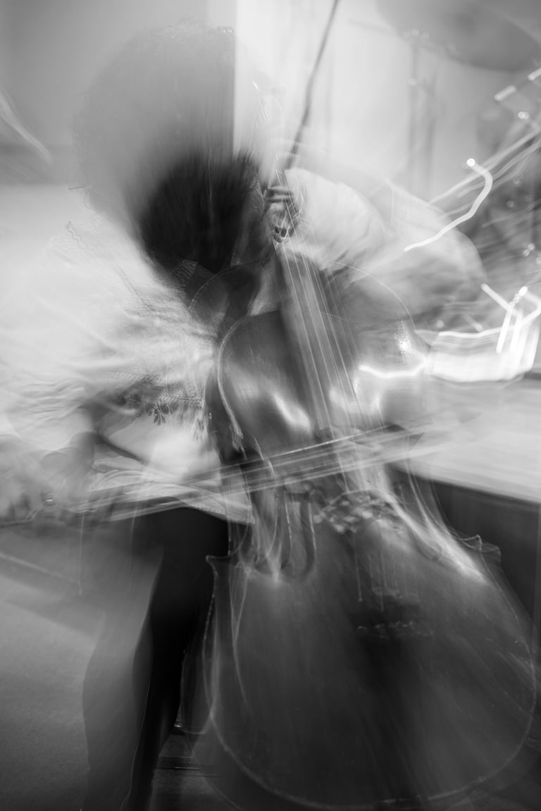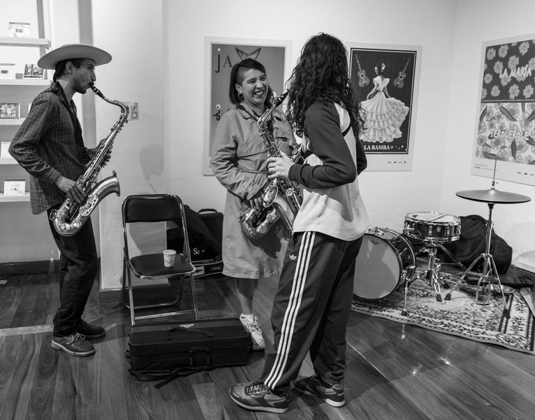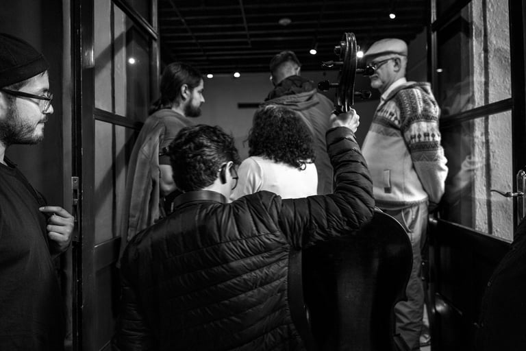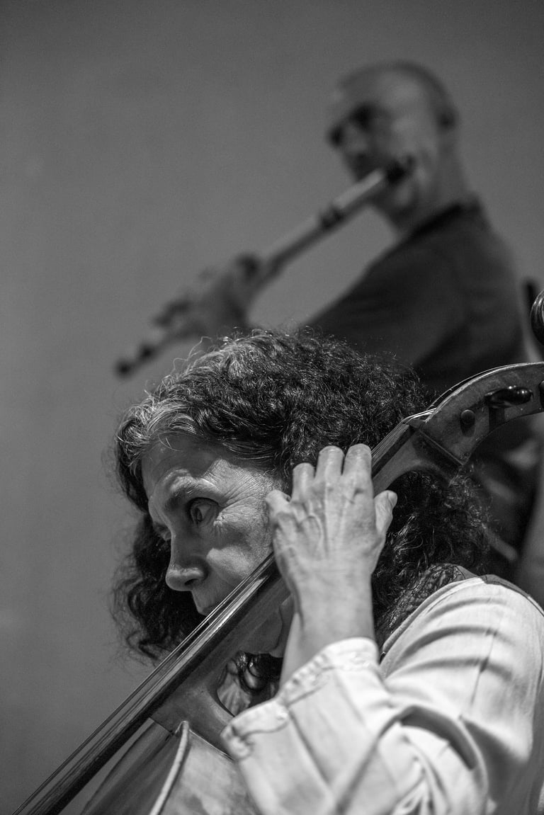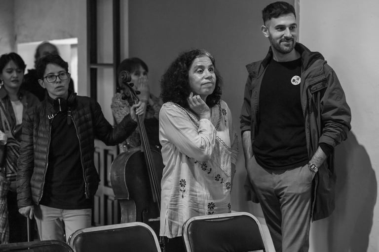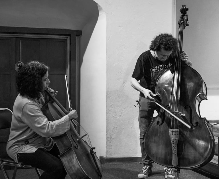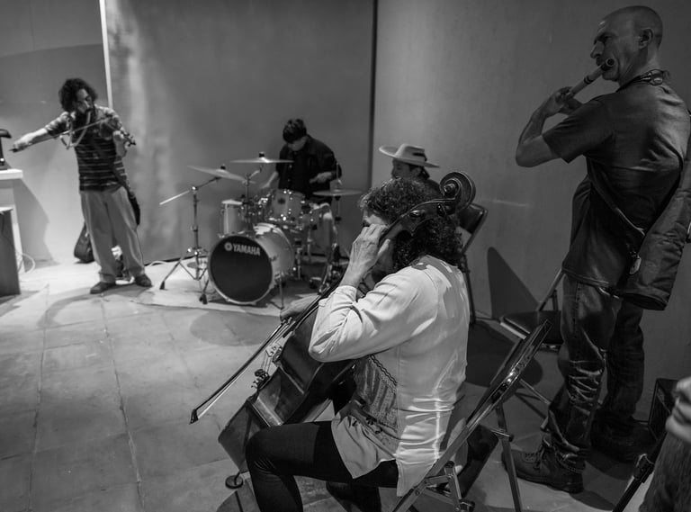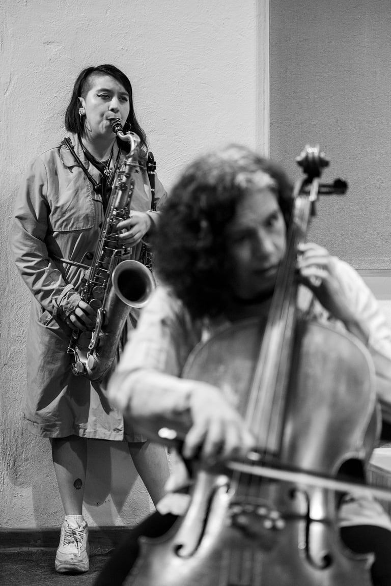 Qué experiencia sentirme entre puro músico de todas las edades, a varios los llamaban maestros y causaban la admiración de los jóvenes. Sencilla y complicada fue esta experiencia. Al principio se hacían grupos de músicos hablando y riendo entre ellos mientras Maricarmen encontraba su primer lugar y se preparaba con su chelo. Cuando llegó el momento de «trabajar» eran más bien miradas entre ellos, y la guía de principio y fin era la música. Sus expresiones eran totalmente corporales, sus voces, brazos, bocas, piernas, ojos se transformaban, se extendían y contraían. Era el instrumento guiando el cuerpo de quien lo poseía pero que inevitablemente se conectaba con el sonido de los otros cuerpos sonoros en el recinto. Entre este ir y venir estaba Maricarmen más atenta que nunca para mezclarse con la exigencia que ella misma se impone para ejecutar su música.