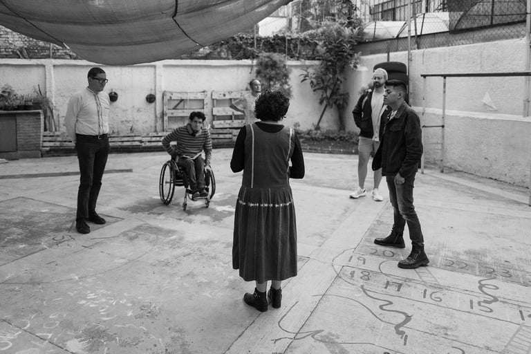 Miércoles 17 de julio 2024. Este taller explora entre el movimiento y el sonido, el cuerpo y la palabra. La reunión fue en una escuela primaria que prestó las instalaciones para llevar a cabo esta actividad. El taller estuvo a cargo de tres guías Maricarmen, Erika y Edgar. La reunión comenzó a las 6 y terminó 9.30.