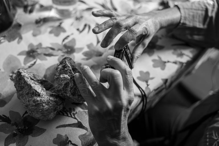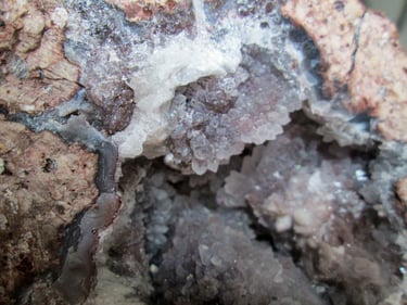 Domingo 28 de julio 2024 : Irlanda me configuró la cámara para poderla usar de la forma más sencilla, sin tener que modificar mucho, si acaso, nada más el poder activar el flash a mi gusto. En esa sesión tomé unas fotos de una geoda que tengo en mi casa, con unos cuarzos, y me gustó mucho poder sumergirme, sobre todo, en las texturas, que es uno de mis temas favoritos.
