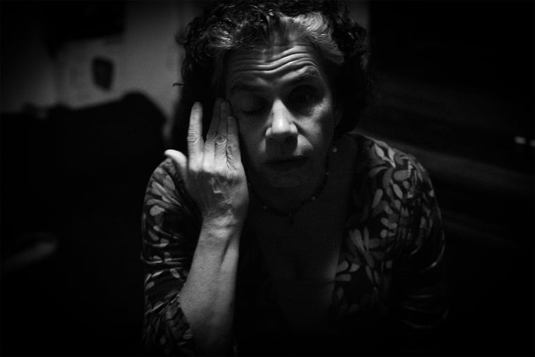 Empezamos a ver las imágenes que tomó durante este inter que no nos vimos y se las iba describiendo, le hacía comentarios sobre sus errores y aciertos. Pasamos por fotos que tomó a la maquillista de la obra, a mí, su amigo Edgar, Himelda una amiga ciega, el Museo de Arte Moderno, retratos de colegas que no veía desde hace 35 años, y llegamos a lo más interesante para mí. Sabía que estaría en el proceso de tener sus ojos nuevos, cuando supe que iría a las pruebas le dije que no olvidara llevar la cámara y que documentara lo que pudiera. Entonces sin saber empecé a describirle la siguiente foto que era un autorretrato en su casa pero tenía la particularidad de que su cara estaba relajada, sonriendo en una actitud de paz…resulta que esta fotografía la tomó pensando en la última foto de sus ojos viejos: «aquí estoy con mis ojos viejos». La siguiente era ella con ojos blancos dentro de un consultorio, al verla quedé impactada del poder que tienen unos ojos que no ven y pensar en lo sólido que se veían unas cuencas rellenas por algo que se convertirían en unos ojos de apariencia real, pero llenos de engaño y belleza.