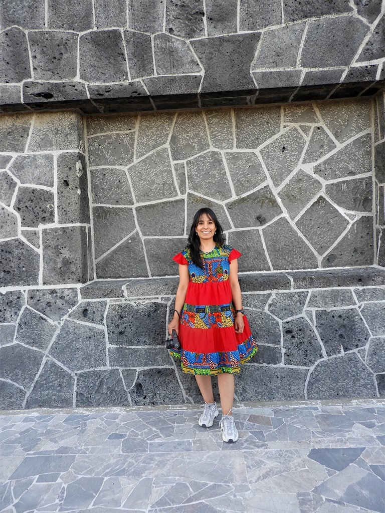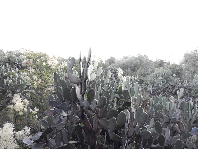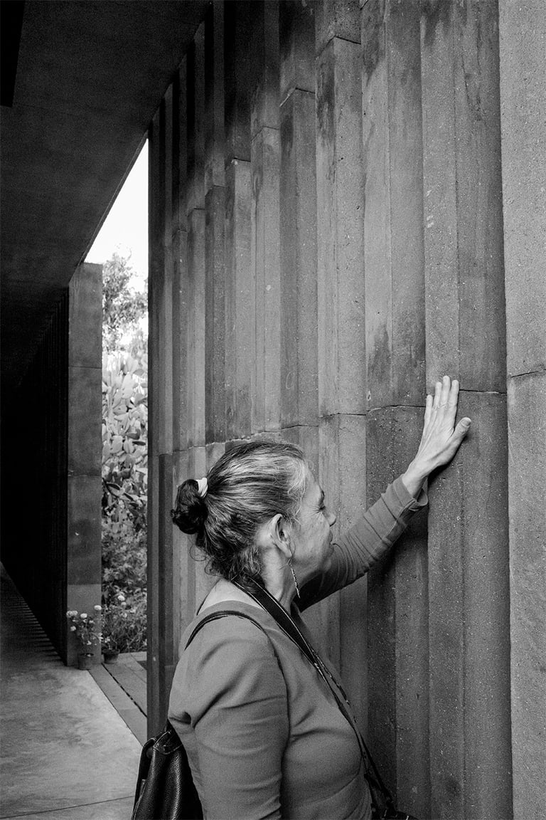 Luego subimos a la azotea e hice unas tomas del paisaje, en el que se veían a lo lejos algunos edificios de la ciudad y el cielo de tarde. Ahí también había algunos espejos sobre los muros, y nos fotografiamos en ellos, y también tomé una foto de Irlanda, que venía con un vestido rojo muy bonito. Me gustó imaginar esa intensidad roja sobre el muro negro de la pared del edificio. Luego, al revisar la foto, también algo que iluminaba era la sonrisa de Irlanda. Luego fuimos a los jardines y tomamos fotos de varios cactus, nopales y otras plantas que había por ahí. Había unas formas arquitectónicas interesantes, pero no supe cómo se podrían captar visualmente para que me dieran la sensación táctil que me dejaban, como de madera. Me pongo a pensar que me encantaría encontrar la forma de expresar las percepciones de otros sentidos a través de la imagen visual, y así también, a través de otras expresiones artísticas, poder evocar percepciones en los demás sentidos, provocar una especie de sinestesia con todo lo que hago en lo artístico. Siento que somos seres integrales que percibimos individualmente, de forma diferente. Unos tienen más desarrollado algún canal perceptivo que otro, pero todas las percepciones convergen en el cerebro y en la emoción en un mismo lugar.