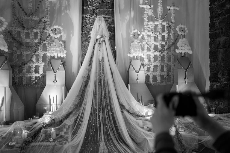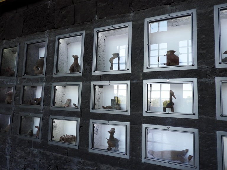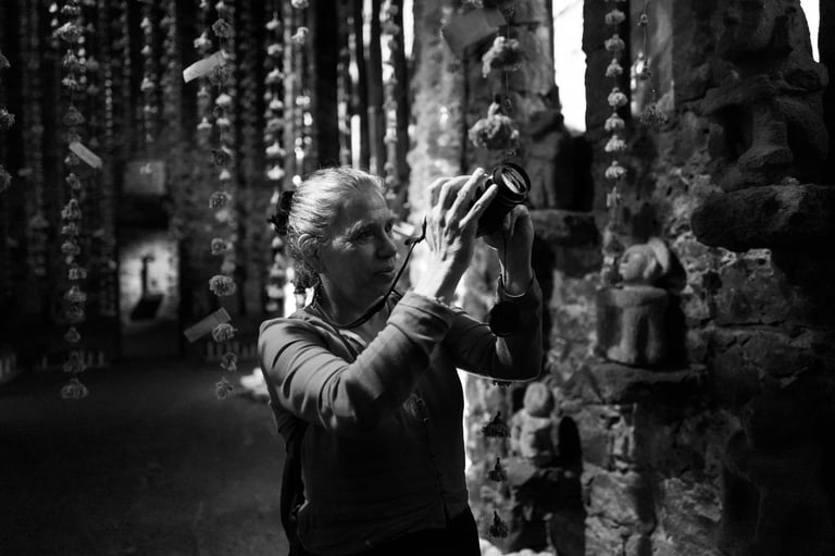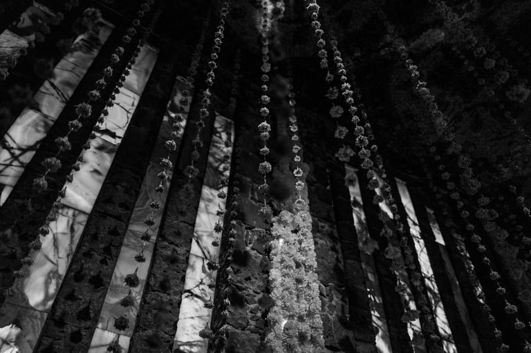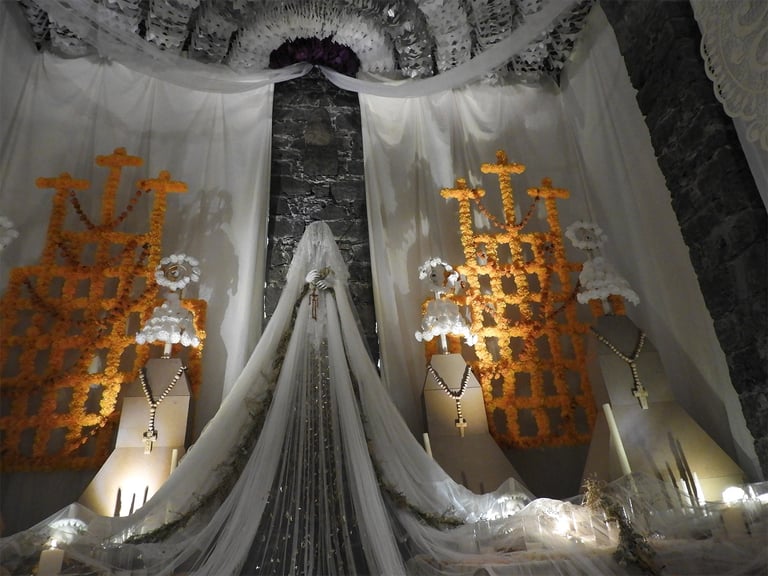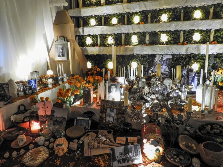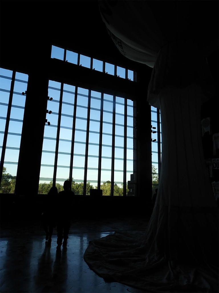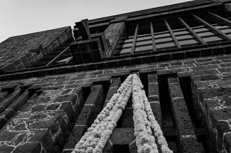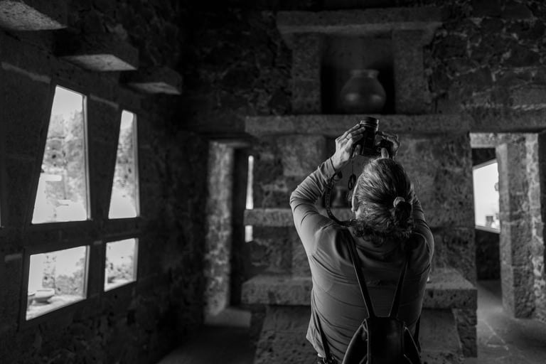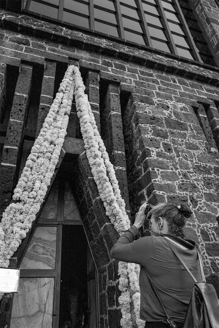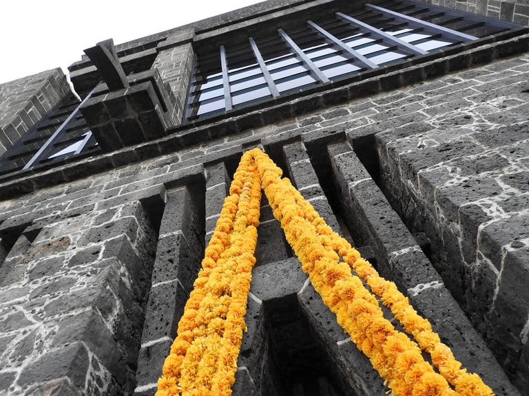 Sábado 9 de noviembre 2024. Siempre, con Irlanda, antes o después de nuestras horas de foto, tenemos un rato para platicar, revisar fotos, avanzar un poco también en las dudas o la técnica fotográfica, y también comer rico. A las dos nos encanta comer. Irlanda me había dado a escoger si íbamos al centro de la ciudad o al Anahuacalli, y pensando en que esos días de principios de otoño la luz de tarde es muy especial, con un tono dorado, me gustó imaginar lo que recordaba visualmente del museo, su piedra volcánica, en combinación también con el verdor de los jardines. Ese día visitamos varios espacios diferentes del mismo lugar. Habíamos querido ir el 2 de noviembre a sacar fotos de las ofrendas, pero yo estaba presionada por un concierto y ya no fuimos. Afortunadamente ese día había todavía algunas ofrendas en el museo, y además algunas bastante artísticas e interesantes. Estuvimos un rato en el interior del museo. Sacamos varias fotos de las ofrendas y de otras cosas que se mostraban ahí. Los colores predominantes eran el blanco y el naranja del Zempazúchitl, y la piedra negra de los muros. Me sentí a gusto con la cámara, mucho más en confianza, sabiendo que ahora sí tenía ya una buena cámara. Había decoraciones de vestidos, calaveras, y otros objetos no tan comunes en las ofrendas. Fotografié también unas vitrinas con figuras de barro con forma de animales, y en general la decoración interna del museo.