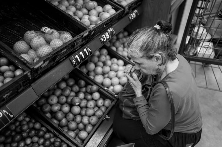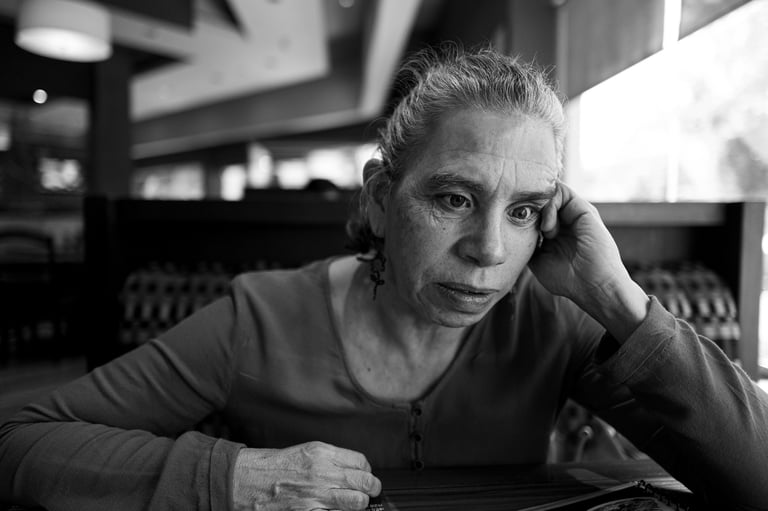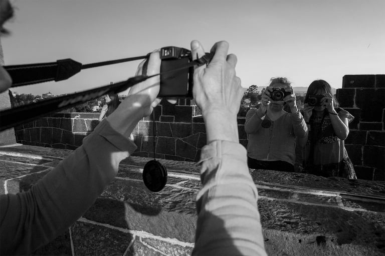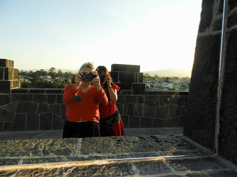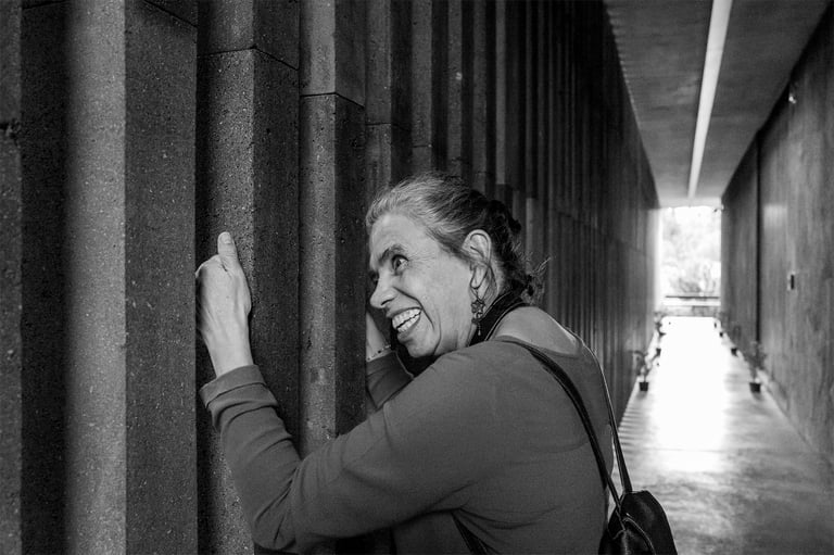 Sábado 9 de noviembre 2024. Pasé por Maricarmen a su casa le pedí de favor dejar mi computadora ahí para no cargarla porque mi espalda está contracturada, de hecho en esta sesión uso una cámara más pequeña para no lastimarme. Nos fuimos a comer y en el camino escuché unas grabaciones porque pronto daría un concierto en Chihuahua y quería saber mi opinión. Durante la comida, como siempre, nos pusimos al corriente en lo emocional, laboral, inquietudes y nuestros avances. Como a las cuatro nos dirigimos al museo Anahuacalli, ella recordaba cómo era y además por ese rumbo vivía su abuela así que le traía buenos recuerdos esta visita. El museo es bastante oscuro con espacios reducidos para ir de una sala a otra y con bastantes escaleras. Maricarmen guardó su bastón y mi hombro era su guía. En la exposición había ofrendas de día de muertos que en el momento de describírselas sentía que me quedaba muy limitada para lo que estaba viendo; ella decía que olía a cempásuchil y que recordaba la arquitectura de piedra. Con su nueva cámara empezó a tomar fotografías de manera más segura, estiraba los brazos o se la colocaba en la cabeza a manera de tripié. También usaba su pecho como referencia y seguimos batallando con los horizontes chuecos. Decidimos que no revisaríamos las fotos tomadas sino que a partir de mi descripción ella decidiría en que dirección tomar libremente. Lo recorrimos rápidamente para llegar al techo donde se podía apreciar la ciudad, ahí me tomó un retrato, sentía agradable el aire y se imaginaba lo cálido de la luz por la hora. Se acercaba la hora del cierre así que nos apuramos para recorrer la explanada y la arquitectura que rodea al museo. Mientras le iba describiendo ella sentía las diferentes texturas del piso, tocó y escuchó la arquitectura. En esta época hay bastantes nopales y casi todo el museo tenía en sus pasillos macetas con cempásuchil; ella percibía los espacio abiertos y noté que no me preguntó dudas acerca del manejo de la cámara. (En la semana estuvimos en contacto por teléfono porque tuvo dudas sobre cómo conectar la cámara para cargar la pila y cuánto tiempo tenía que dejarla conectada, pero además tomaba unas fotos y después ya no quería; me puse a ver en el manual y le di las instrucciones para la pila. Se le ocurrió usar otra tarjeta y fue la solución para que ya no se trabara al tomar fotografías, me dio mucho gusto que no hubo necesidad de vernos y ella logró resolver estas situaciones.) Disfrutamos mucho esta visita. Ya de regreso a su casa tenía que hacer unas compras y la llevé al supermercado las dos llevábamos el carrito a manera de guía para ella. Sabía perfectamente lo que quería, lo que le hacía falta, reafirmaba el producto preguntándome de qué color era la caja y una de las maneras de saber que está comprando correctamente la fruta es olerla y por supuesto sentirla. Así que compró víveres, medicina, cosas personales y vino (me regaló una botella). Y yo aproveché para hacer mi super también. Llegamos agotadas las dos a su casa pero logramos avanzar en muchas cosas.