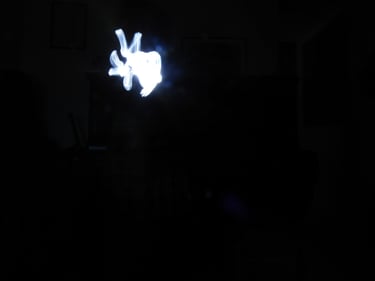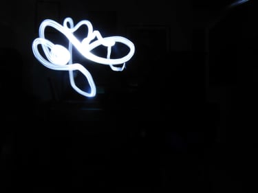 Domingo 8 de diciembre 2024. En cuanto al pintado con luz, volvimos a intentarlo y como no lo habíamos hecho de nuevo, se me habían olvidado cosas importantes, pero ahora lo bueno es que mi cámara ya quedó configurada para poder hacer pintado con luz activándole el modo manual que ya está preconfigurado, por lo pronto. Ya encontré también el lugar correcto para poner la cámara, midiendo el espacio con unos palitos que tengo y una tarjeta, y con mis brazos, tengo delimitado el espacio que puedo usar para trazar mis líneas con luz. También sé la distancia correcta desde la cual tengo que dibujar con la lámpara. Todo esto lo registré en grabación, por si algo se me llega a olvidar o por si se desconfigura.