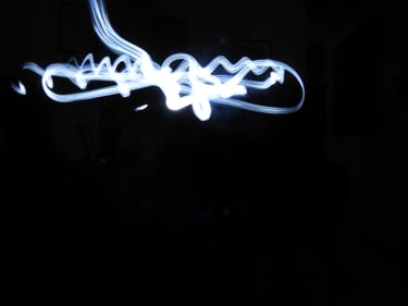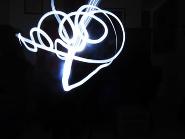 Domingo 8 de diciembre 2024. Esta sesión fue nocturna ya que volveríamos a practicar el pintado con luz y justo en casa de Maricarmen para que en su entorno pudiéramos controlar el espacio, las distancias, los parámetros en la cámara y se vuelva una práctica fácil para ella. El pintado con luz es una técnica fotográfica donde la cámara estará tomando una imagen durante segundos y en ese tiempo el fotógrafo usa el espacio como lienzo usando lámparas que apuntan hacia la cámara y por tanto dejará líneas de luz y/o para dirigir la luz a un objeto y justo por donde pase la luz será lo que se registrará en el sensor como imagen. Es por eso que esta técnica podría convertirse en la favorita de Maricarmen porque aunque parezca difícil además de ser divertida, se tiene que tener el control del espacio y parámetros de la cámara porque la toma se realiza en completa oscuridad.