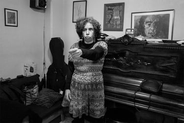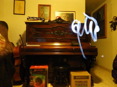 Ahora sí empezaba la práctica; ella tiene que colocar su cámara en algo estable así que usamos su mesa; la cámara no debe moverse, debe estar derecha y debe prepararla con los valores de velocidad 15 segundos de exposición, diafragma cerrado para que todo quede oscuro (7.4) y un ISO 100. También le enseñé cómo colocar el timer que le permitiría tener 10 segundos antes del click para ir y ponerse en el lugar indicado; sin embargo esa función no fue práctica porque lo tendría que estar programando en cada toma y eso complicaría la logística. Ella se las ingenió para usar su brazo, luego un palito y establecer la distancia a la que la cámara debería estar en la mesa, uso un plástico para asegurarse que estaba viendo de frente y no sesgada. Despejó el espacio y solamente le ayudé a determinar qué tanto abarcaba la toma para establecer qué tanto podía moverse a la derecha o izquierda. Su piano fue la referencia y a la altura que estaba la cámara le permitía hacer el pintado a la altura de su pecho, cintura y hasta medio muslo.