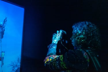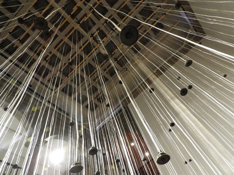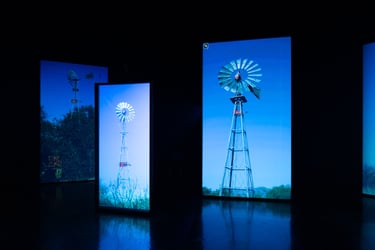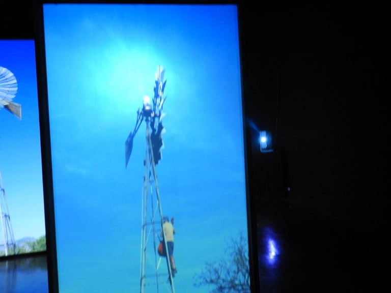 Domingo 19 de enero 2025: Visitamos esta exposición de diseño sonoro, captado por Félix Blume, sonidista francés, investigador en las peculiariedades de los sonidos que le aparecen en el camino. Yo conocía a Felix Blume cuando impartió un taller de grabación para ciegos. Desde entonces establecimos una amistad, y cada que presenta algo en la ciudad de México me invita. También tuve la fortuna de participar en un taller de grabación que impartió en 2022 en la ciudad de México para cineastas y sonidistas. En esta ocasión, cuando visitamos su expo, presentó en el Laboratorio Arte Alameda una muestra con 2 de sus proyectos, uno con unos molinos de viento que, con su movimiento, activaban la sonoridad de unos violoncellos que pendían de una instalación que él hizo bajo estos molinos. También expuso una colectividad de abejas zumbando desde su individualidad. Eran muchas bocinas con el sonido personal de cada abeja, que, al escucharse todas juntas, creaban un zumbido generalizado. Acudimos a esta expo con mi amiga Helena Maldonado, psicoanalista, además de Irlanda y yo. Fue muy interesante escuchar a mis dos amigas, cada una desde su trinchera, procurando sus descripciones de las imágenes visuales de la expo. Observé que Irlanda es, sobre todo, ojos, y Helena, análisis humano. A ambas las etiqueta su actividad. Eso me encanta de los recorridos en exposiciones donde hay diferentes personas describiendo las imágenes o lo que sucede desde lo que se ve, o desde cómo es el ambiente visual. Finalmente, como lo platicamos constantemente con Irlanda, el que describe, más que describir lo que describe, se describe a sí mismo. Tomé algunas fotografías de los molinos, y otras tantas de eso que se utilizaba para amplificar el zumbido de las abejas, que eran pequeñas bocinas pendientes del techo. Hice algunas capturas de ellas, aunque, al parecer, ninguna de esas imágenes resultó lo suficientemente interesante como para mostrarla como foto estética. Voy entendiendo poco a poco que hay diferentes tipos de fotos: las que pueden tener un impacto estético, las de un impacto ilustrativo, o las de un impacto de significado. Hay que aprender a definir y entender esas intenciones en nuestras fotos. Aun así, con todos los percances visuales que pudo haber habido, en las fotos de los molinos de viento, hubo algunas mejorías en mi técnica de fotógrafa. Según entiendo, ya no se inclinan tanto mis fotos hacia la izquierda. Puedo decir que esas fotos estuvieron felices, tomando en cuenta el momento en que fueron captadas, porque algo del sonido de esa instalación, también me emocionó y se convirtió en imagen visual. Cada día estoy más convencida de que gracias a la sinestesia, percibo este mundo de una forma mucho más integral.