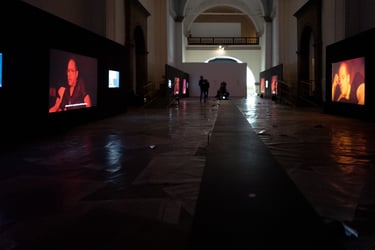 Por último la sala de Sara Eliassen: Imágenes [Y cómo contestarles] Seis televisores mostrando documental de la violencia sistemática en México. Otra vez un espacio con un techo alto, en el fondo una pintura propia de la iglesia y las pantallas se encontraban montadas en una especie de andamio y cada una tenía un audífono para escuchar.