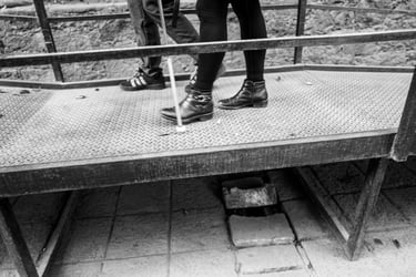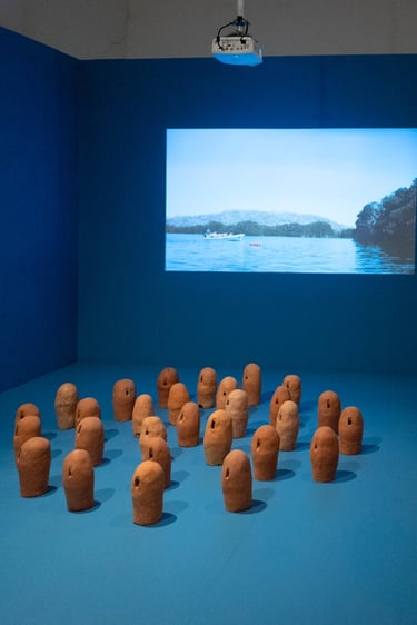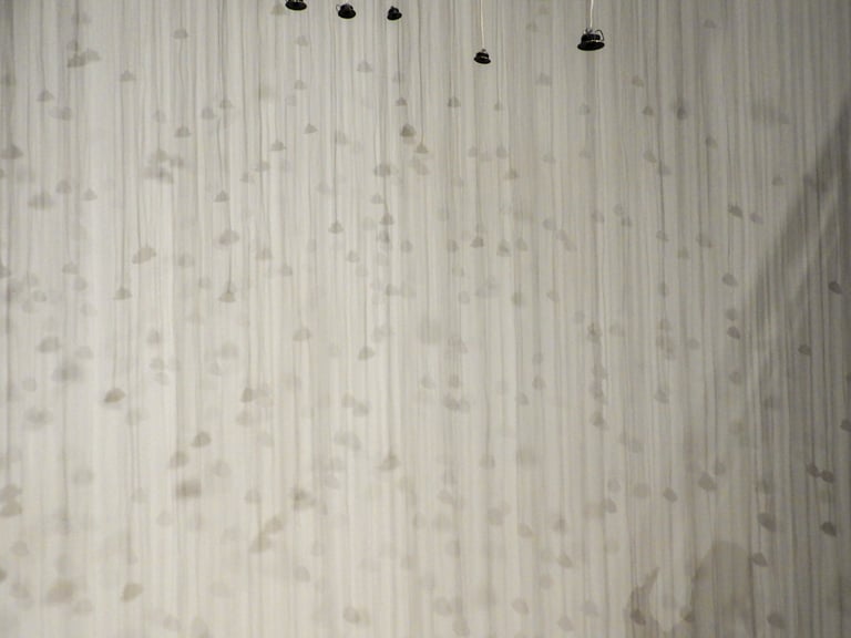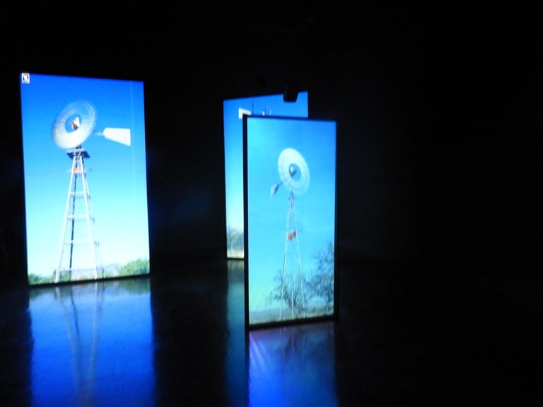 En la siguiente sala se encuentra exponiendo su amigo Félix Blume: Variaciones sobre el murmullo. Su primer proyecto llamado Suspiros, se ve en un ciclorama azul varias ocarinas (flautas de barro hechas por niños de la escuela Melchor Ocampo de la comunidad de El Zapotalito, usando moldes de papaya) y un video de un grupo de niños en una lancha que soplaban este instrumento. Era un concierto porque estas ocarinas también estaban dispuestas como conjunto dentro del agua y cada vez que el agua tapaba los orificios, con su mismo ir y venir, salía el sonido propio de la ocarina; así que entre los niños y el agua se escuchaba un concierto dado por la naturaleza y los niños. Maricarmen pudo fácilmente identificar el sonido de la ocarina, quería tocarlas pero no se podía. Para ir al siguiente espacio había una rampa; era una lugar muy oscuro titulado Suite de Chelos el espacio tiene pantallas verticales, unas de tres metros y otras más altas, en ellas se proyecta el video de un molino al que se le había montado un chelo y el mismo aire que giraba el molino hacía que el chelo sonara. El color predominante era entre azul y rojo y se podía escuchar el chelo sin tener claro si era siempre el mismo sonido de manera cíclica aunque Maricarmen lograba captar diferencias entre cada pantalla. Se emocionó al estar ahí porque Felix Blume le había contado de este proyecto con anterioridad. En este espacio sí pudo tocar la pantalla donde se proyectaba la imagen, se quedó un buen rato escuchando y aquí fue donde sacó su cámara para comenzar a fotografiar. Me comentó que había estado intentando corregir los horizontes caídos. En el siguiente espacio se encontraba la instalación de Blume titulada Enjambre son 250 bocinas pequeñas y en cada una se escucha el zumbido de una abeja volando. Las alturas son diferentes y te permiten estar bajo ese conjunto de abejas así que se podía apreciar de manera muy particular el zumbido a veces más fuerte o bajo. Este espacio ya no era oscuro y jugaba visualmente en el espacio las sombras de los cables de esta instalación. Maricarmen tocó las bocinas y sin querer derrepente una que otra le tocaba su cara. Aquí también tomó fotografías.