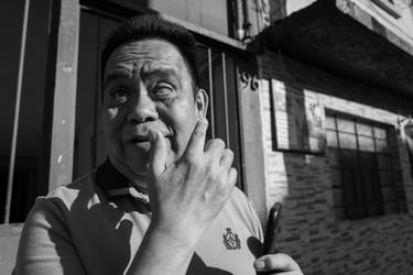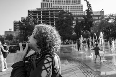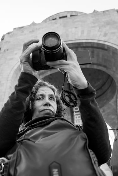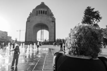 Domingo 26 de enero 2025. Un día nos reunimos para visitar el Monumento a la Revolución. Nos vimos en mi casa, y ahí tomé algunas fotografías de la fachada de mi edificio y de un amigo. Ya, en el lugar, capté algunas imágenes de una fuente que elevaba y disminuía el chorro de agua. Había unos niños frente a las fuentes, y, con el típico instinto de niños, se aventuraron a meterse debajo del chorro de agua de la fuente. Quise captar algo de ese momento, orientada por los ojos de Irlanda. Salieron algunas fotos, utilizando el acercamiento de la imagen, con lo que, según me decía Irlanda, captaba un poco de la expresión de un niño que expresaba con toda su actitud que tenía frío, después de haberse mojado bajo el chorro. Después nos acercamos a donde estaban presentándose algunos colectivos de indígenas vestidos con sus atuendos regionales, tocando música de sus lugares, y también capté algunos de estos momentos musicales y folkclóricos, con mucha asesoría de Irlanda, quien espiaba desde la ventanita de mi cámara. Quise aplicar el telefoto, acercando mi lente a lo que sucedía, y entendí que requiere de demasiada precisión para determinar la colocación de la cámara. Aun así, la estuve utilizando con la ayuda visual de Irlanda. Creo que, a pesar de que mucho de este día estuvo asesorado por los ojos de Irlanda, voy tomando más dominio de mis manos y de mi iniciativa. Siempre habrá en el campo de mi imagen propuesta accidentes, pero cada día entiendo también que el trabajo colaborativo es el que aporta los mejores resultados a la labor creativa de este mundo. Las últimas imágenes captadas en ese día fueron de un puesto de elotes y de su vendedora, y lo que pude fotografiar de esto, tuvo mucha más conciencia de lo que estaba captando.