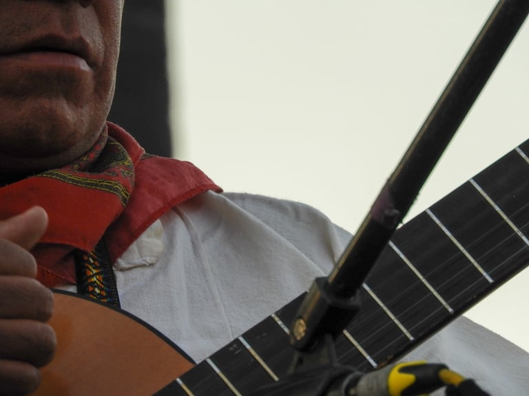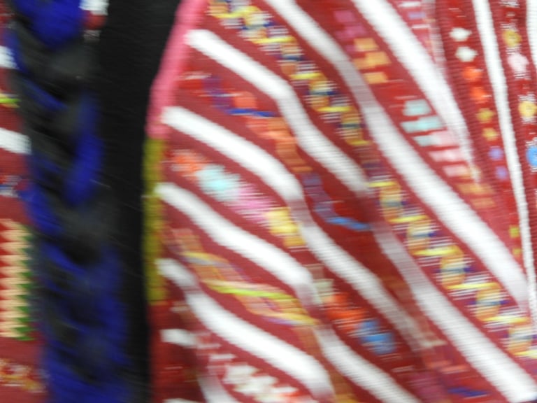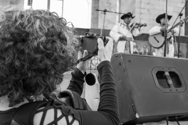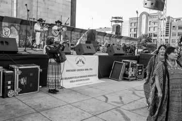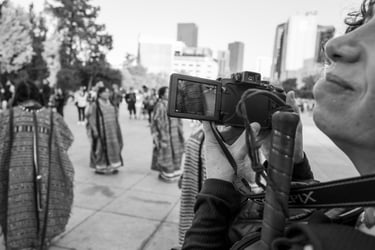 Al llegar al Monumento me estacioné casi enfrente de éste y mencionó que hace algunos año ella trabajo por ahí y recordaba un oxxo que aún sigue ahí. Mientras nos acercábamos al monumento le describí la escena de manera general comentando los chorros de fuentes, que el monumento se encontraba con una valla y que había gente en una tarima diciendo cosas como una especie de manifestación. Eran casi las cinco de la tarde así que ya se veía el sol cayendo, nos pusimos frente a las fuentes que sacan chorros de vez en cuando y que entretiene a muchos niños que sin pena y sin frío se mojan, remojan y remojan cada vez que el chorro de la fuente sale y crece de manera sorpresiva. A esa hora eran pocos los valientes que ya titiriteaban del frío que se comienza a sentir en el atardecer. Maricarmen se puso frente a las fuentes con esa actitud de contemplación auditiva y con una postura en su cuerpo que parece que está firme sin tambalear con su mochila en el pecho y la cámara recargada solo esperando y escuchando. Le ayudé con algunos encuadres ya que fue el momento oportuno para repasar en la práctica el resultado de usar la cámara en gran angular y telefoto. Batallamos un poco con el telefoto porque al acercar tanto era fácil perder el motivo principal de la fotografía. Le propuse hacer un ejercicio: que nos pusiéramos de espaldas y mientras ella tomaba algo desde su punto de vista, yo haría la misma toma para capturar justo el otro lado. Sólo puede hacerlo al principio después era difícil lograrlo. Caminamos para acercarnos a las tarima y en ese momento estaban dos personas tocando el violín y mujeres bailando abajo con sus trajes típicos. Le describí a Maricarmen la escena, caminamos hasta estar tocando la tarima, lo que nos permitió estar muy cerca tanto de los que cantaban como de las que bailaban. En ese momento me sentí rara de poder estar tan cerca de esto que estaba ocurriendo, rebasamos la línea del poco público que había, pero mi sorpresa era sentirme como fantasmas, parecía que nadie se daba cuenta que estábamos ahí, no nos decían nada. Maricarmen se notaba curiosa ¿qué tendría ella en su imagen auditiva?