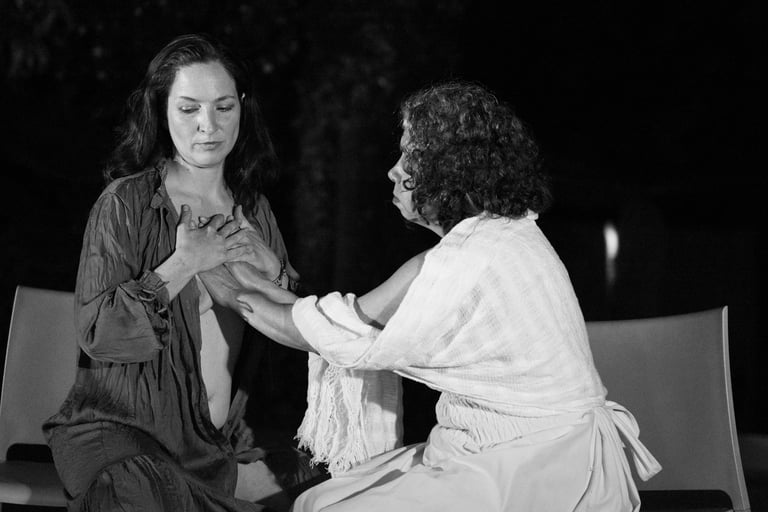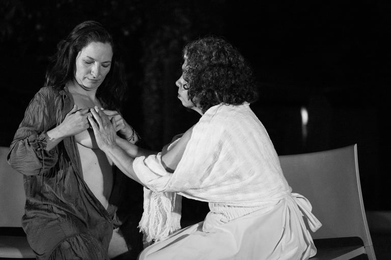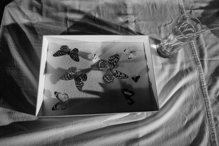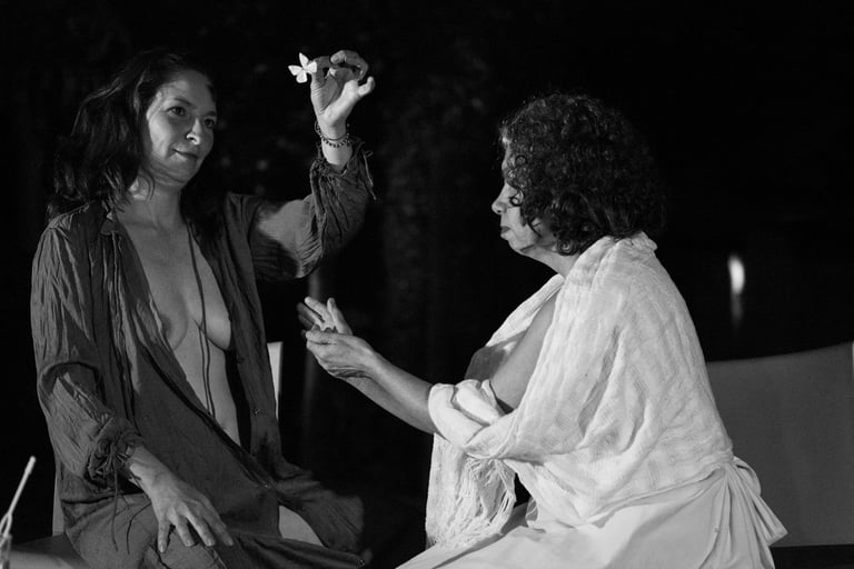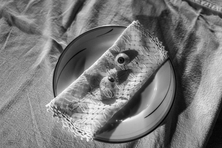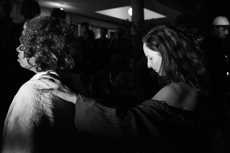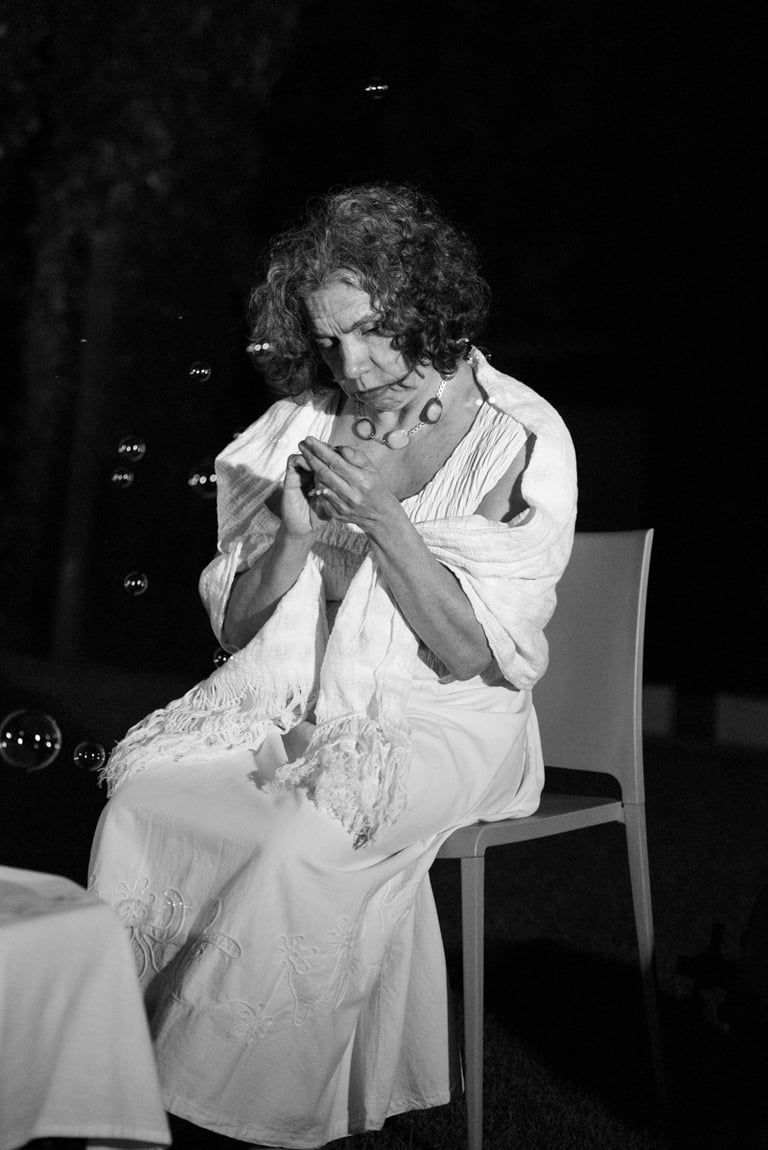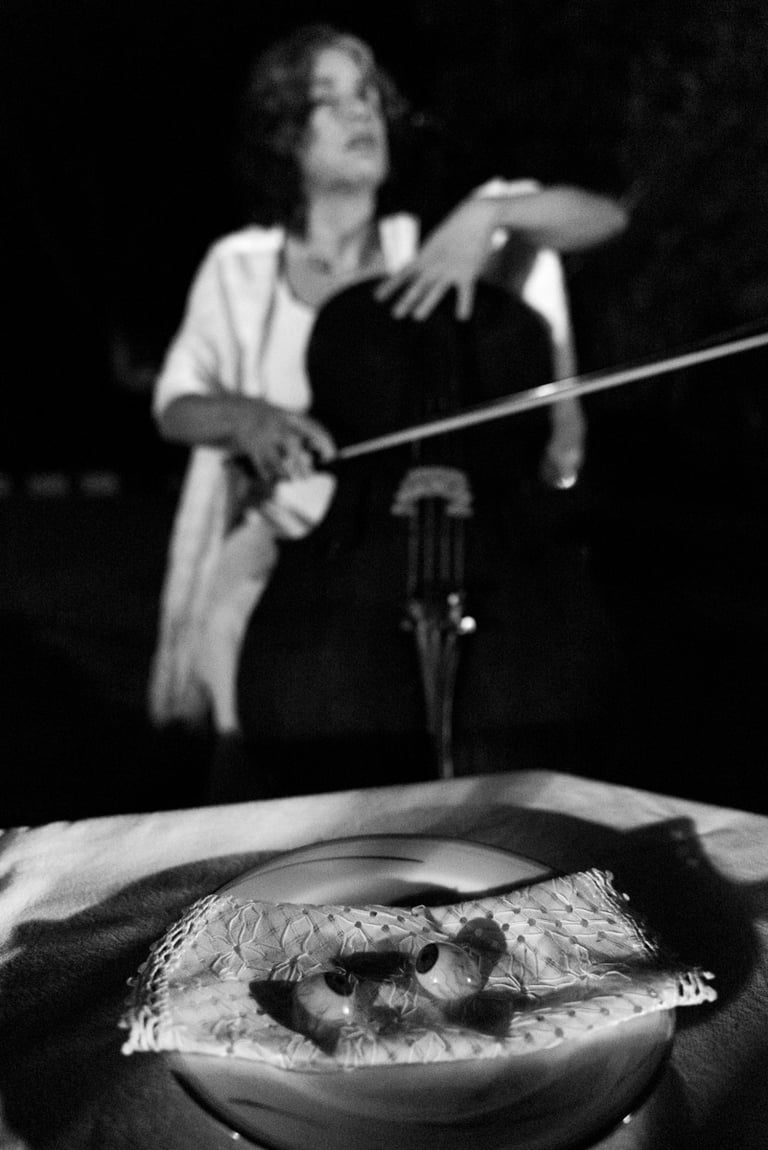 Maricarmen ya me había descrito cómo sería el performance pero cuando empezó, el ambiente influyó en gran manera en mi percepción. En un jardín muy oscuro hay una mesa con mantel blanco, un plato con una servilleta de tela, una caja de unicel con mariposas disecadas, un vaso con agua para hacer burbujas. Frente a esta mesa dos sillas, sentada del lado izquierdo Katiuska con un vestido verde holgado y del lado derecho Maricarmen con un vestido blanco y un rebozo blanco, ambas sin zapatos. El performance comienza con música de fondo y sin hablar suceden varias cosas: Maricarmen entre burbujas se quita sus ojos y los deja en el plato sobre la servilleta, siente el corazón de Katiuska y le entierra una mariposa con un alfiler muy fino. Katiuska se levanta y camina con su caja de mariposas para que la gente del público de manera voluntaria le entierre más mariposas en su torso desnudo; mientras tanto Maricarmen tocaba su chelo, al terminar de enterrar las mariposas en el torso de Katiuska ella regresa por Maricarmen y salen de escena. ¿Qué sentí ante estos acontecimientos en mi papel de fotógrafa y amiga de Maricarmen?: Reconozco la puntualidad del performance, sin duda era algo visualmente más atractivo que sonoro, yo ya había visto a Maricarmen sacarse sus prótesis en un documental que está haciendo con su amigo Edgar, nunca en vivo, disfruté el silencio y el ritmo suave del juego entre las manos de Maricarmen (suaves y cuidadosas) y Katiuska para dirigirla siempre a su cuerpo. Había muy poca luz en el lugar y la gente no se atrevía hacer voluntaria tan fácilmente, más bien Katiuska con su mirada penetrante los invitaba a participar. Las miradas y la gente giraban en torno a Katiuska hubo una falla de sonido que no permitió que el chelo también fuera protagonista. Después de tal vez diez o quince minutos salen del jardín para finalizar el performance.